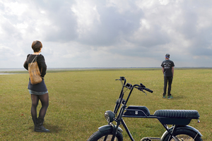 2014Drie dames bewonderen een bloembollenveld met drie grote schuren die het landschap verstoren.
