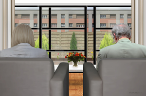 2014Een man en een vrouw in hun stoel. De man leest een boek en de vrouw kijkt naar de tuin.